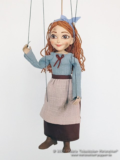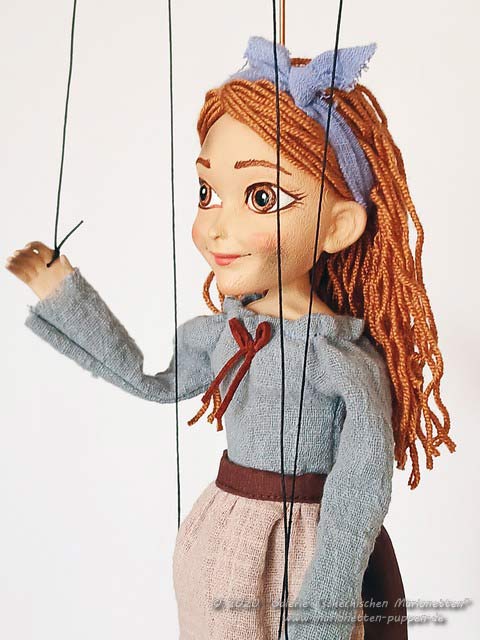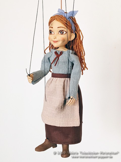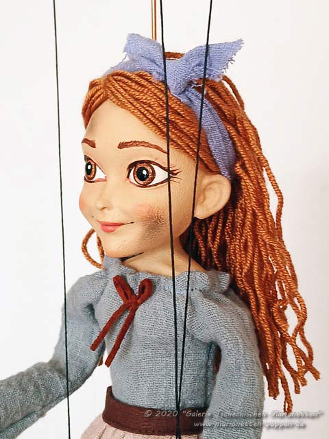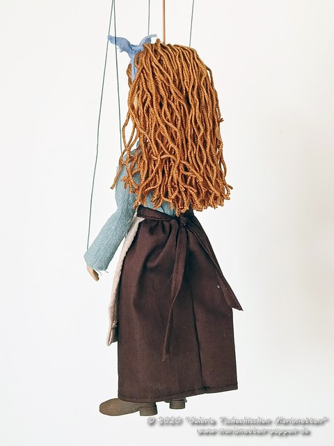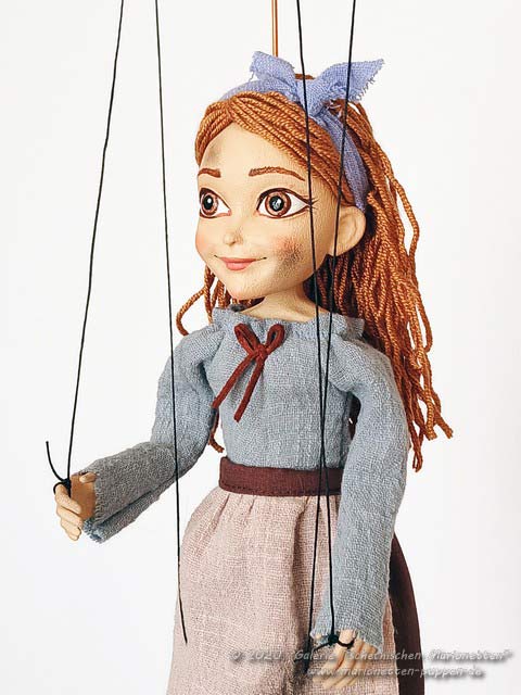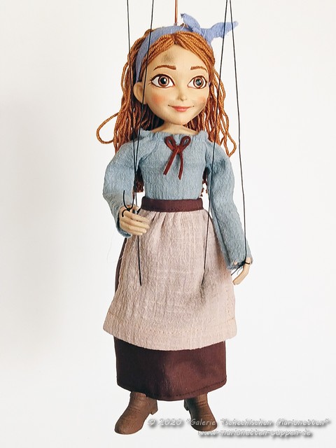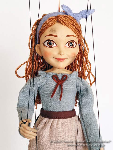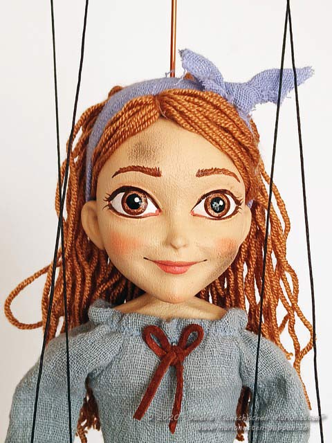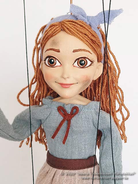 The puppet's head and arms are made of special shockproof elastic material, legs and footwear are made from wood. Clothes are made by hand of natural materials: flax, cotton or leather. Marionette is controlled with the help of a cruciform rocker, metal wire and threads. The control system ensures great freedom of the doll’s movements.