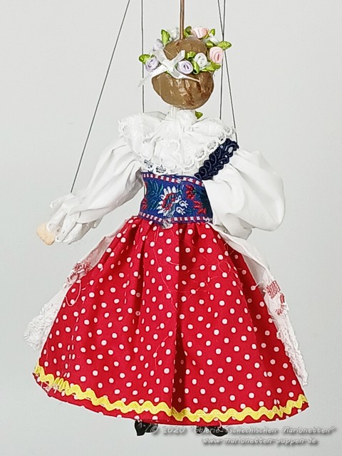 Puppet Costumed Czech marionette with thread hand guidance and rocker. The puppet's head and limbs are cast from plaster modifications. Other parts are wooden and connecting parts are made of wire. Hand-painting of the puppet is done with harmless water-resistant paints. The puppets are intended for collectors and the puppet theater, or as an original educational aid or as a play tool. Made by hand, slight variations in fabric and color may occur.
